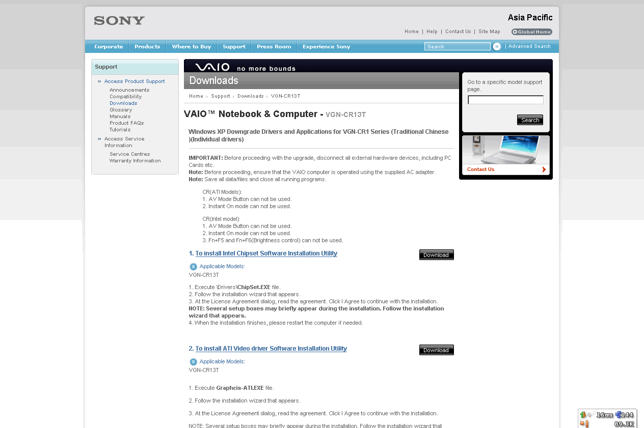 下載VGN-CR13T驅動程式的官方網頁 用著我破破的英文(真慶幸電腦裡面會出現的單字大概就是那些了),看著他一串串的驅動程式